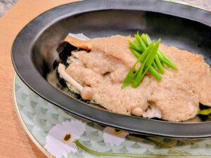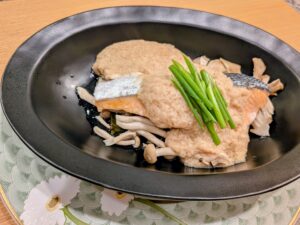 とろろのソースで蒸し上げる鮭のお料理です